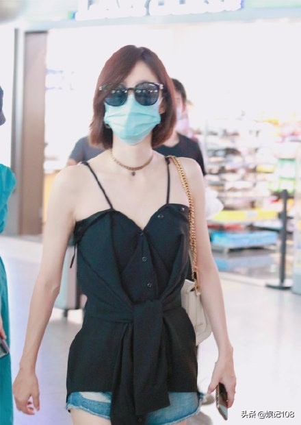 王丽坤最新机场照,黑色吊带搭配牛仔短裤,既凉快又时尚
