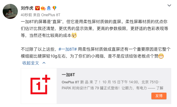 而另一边一样有一款120Hz高刷新频率新手机被官方宣布——一加8T。从一加官微发布的信息内容看来,一加8T将选用120Hz高刷新频率的软性直屏。和华为公司初次抢鲜不一样的是,一加早在上半年度的一加8 Pro上就用到了120Hz高刷新频率,在120Hz的动画特效、互动兼容这些层面早已有完善工作经验。本次一加8T用上120Hz高刷新频率当然是“顺理成章”。